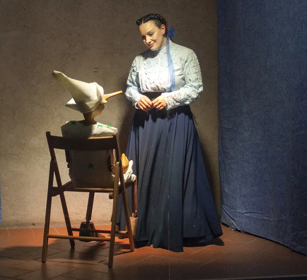 Lo spettacolo porta in scena il microcosmo collodiano attraverso i suoi personaggi principali, mettendo in luce l’amore incondizionato di Geppetto, il potere salvifico della Fata, la voce della coscienza che parla attraverso il Grillo, la figura ambivalente di Mangiafoco e le ladronesche furberie della Volpe e il Gatto. Sono le figure chiave del viaggio tra ingenuità e redenzione che porterà il burattino Pinocchio – che si materializza nella realizzazione dell’artigiano Mario Raineri degli Amici dell’Arte di Lumezzane – a diventare un bambino vero.